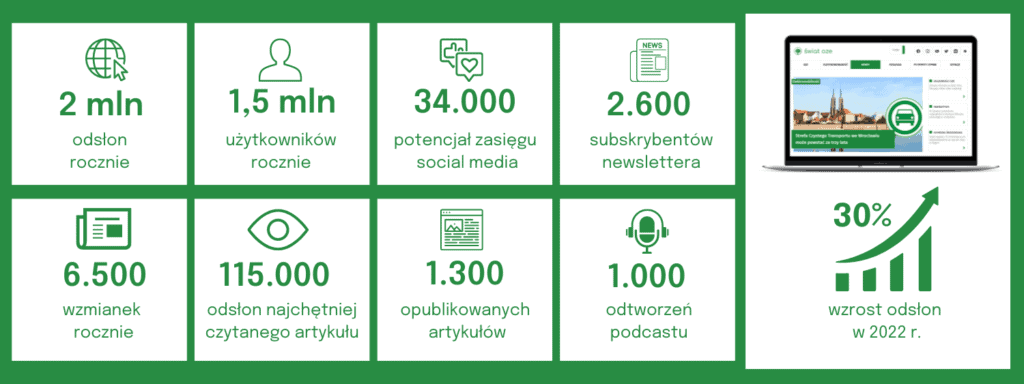 Portal Świat OZE działa na rynku mediów od 2015 roku. Od tego czasu informuje i edukuje w kwestiach związanych z odnawialnymi źródłami energii, transformacją energetyczną i technologiami dla klimatu. Skupia wokół siebie czytelników zainteresowanych newsami z branży, opiniami i informacjami dotyczącymi OZE, jak również różnego rodzaju ciekawostkami z Polski i ze świata.